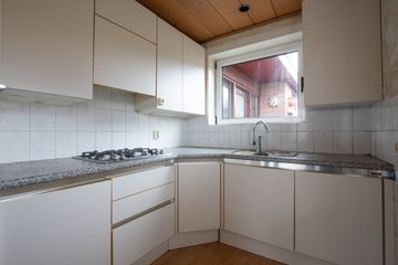 De keuken is gesitueerd aan de achterzijde van de woning en kijkt uit over de achtertuin. De keuken is voorzien van een vierpits gasfornuis en een koelkast.