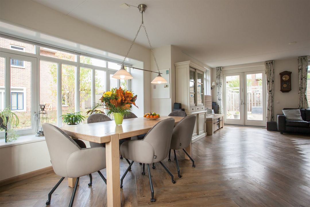 De woonkamer: Wat een fijne ruimte! De woonkamer is heerlijk licht en beschikt over grote raampartijen aan de achterzijde en een raam aan de hoekzijde, waardoor er altijd veel lichtinval is. Door de openslaande deuren voelt de tuin als het verlengde van de living.