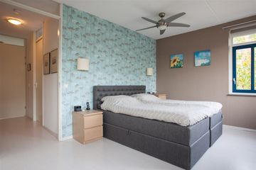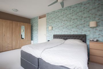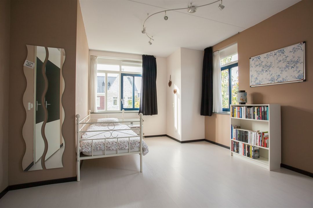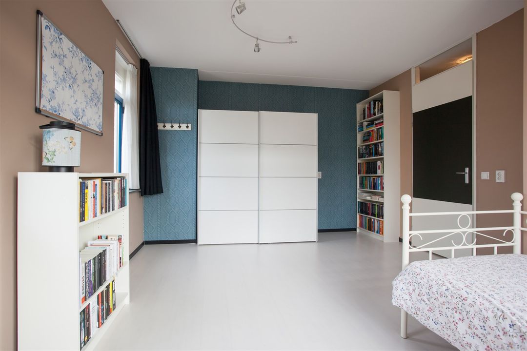 De master bedroom: Ook in deze ruime slaapkamer veel lichtinval dankzij de vele raampartijen! De kamer beslaat de volle breedte van de woning. Genoeg ruimte voor een riant tweepersoonsbed en een grote kledingkast. Beide slaapkamers op de eerste verdieping hebben een witte laminaatvloer.