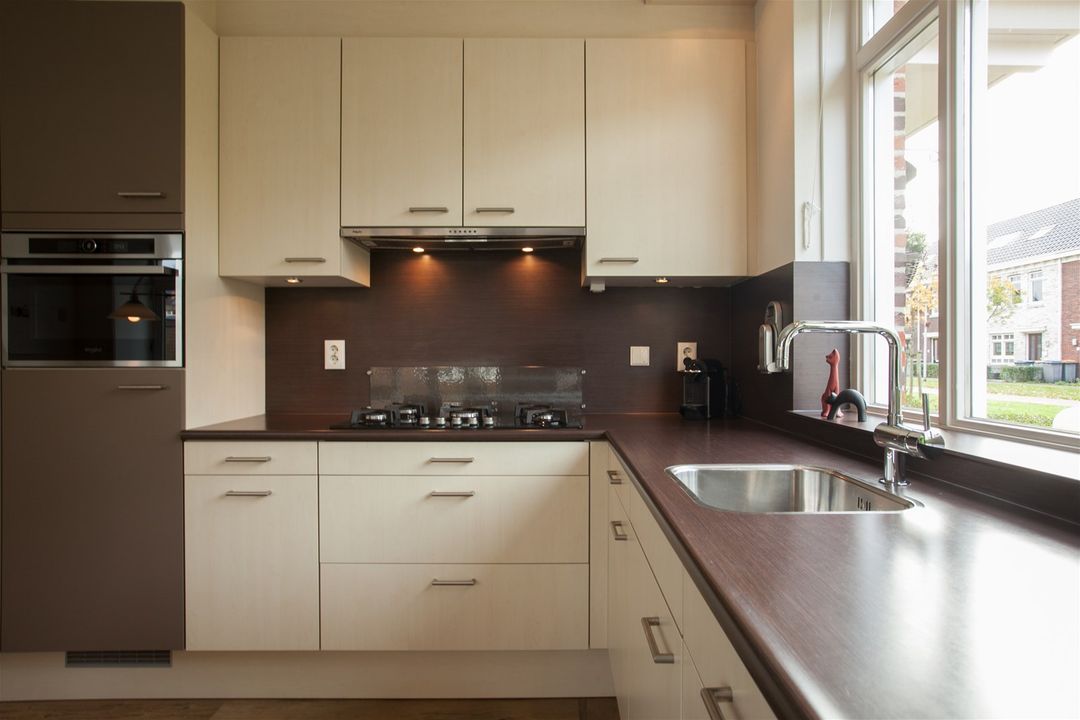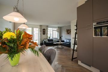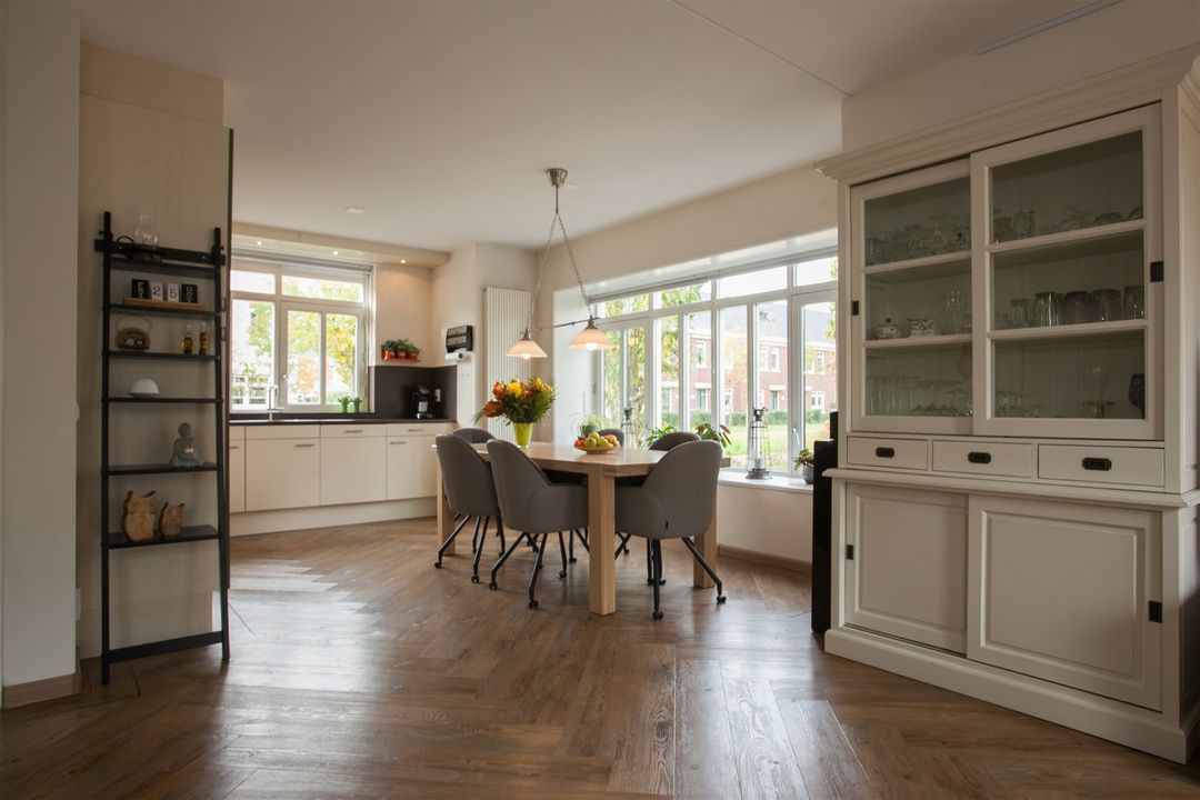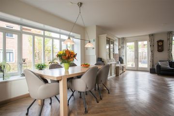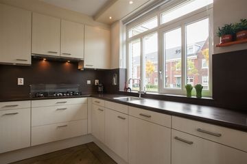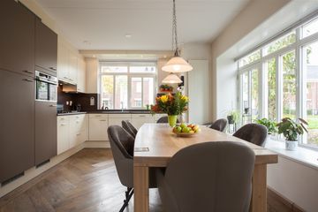De woonkeuken: De open keuken is gelegen aan de voorzijde en heeft eveneens een fijne lichtinval dankzij de grote ramen en de erker aan de zijkant. De keuken is van alle gemakken voorzien om de heerlijkste gerechten te bereiden met een 5-pits gaskookplaat, een afzuigkap, een vaatwasser, een combi oven/magnetron, een koelkast en een vriezer. Er is genoeg ruimte voor een grote, gezellige eettafel.