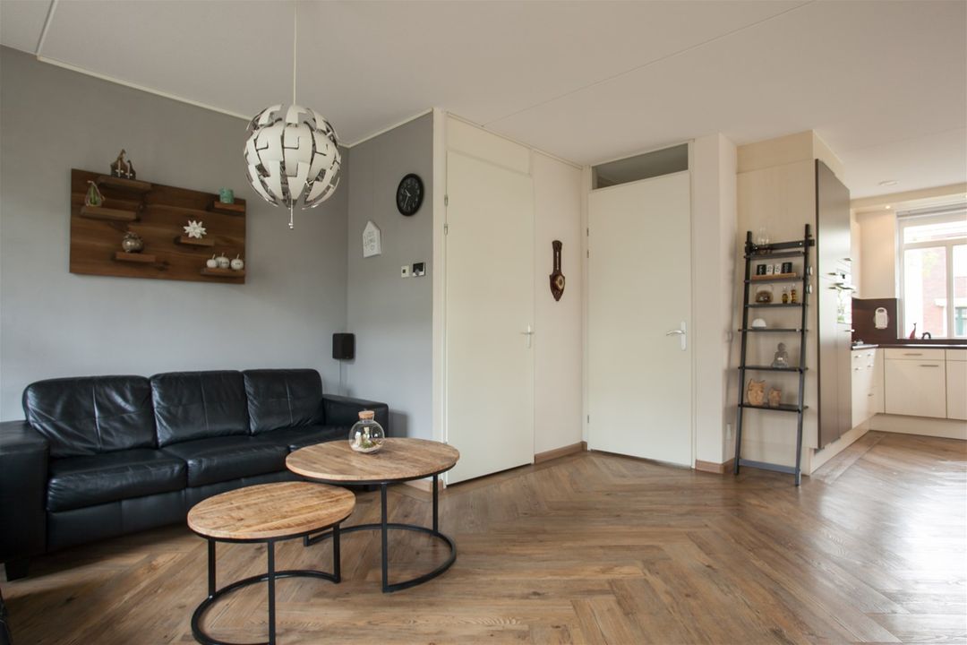 – Woonkamer en open keuken voorzien van PVC-vloer in visgraat motief;