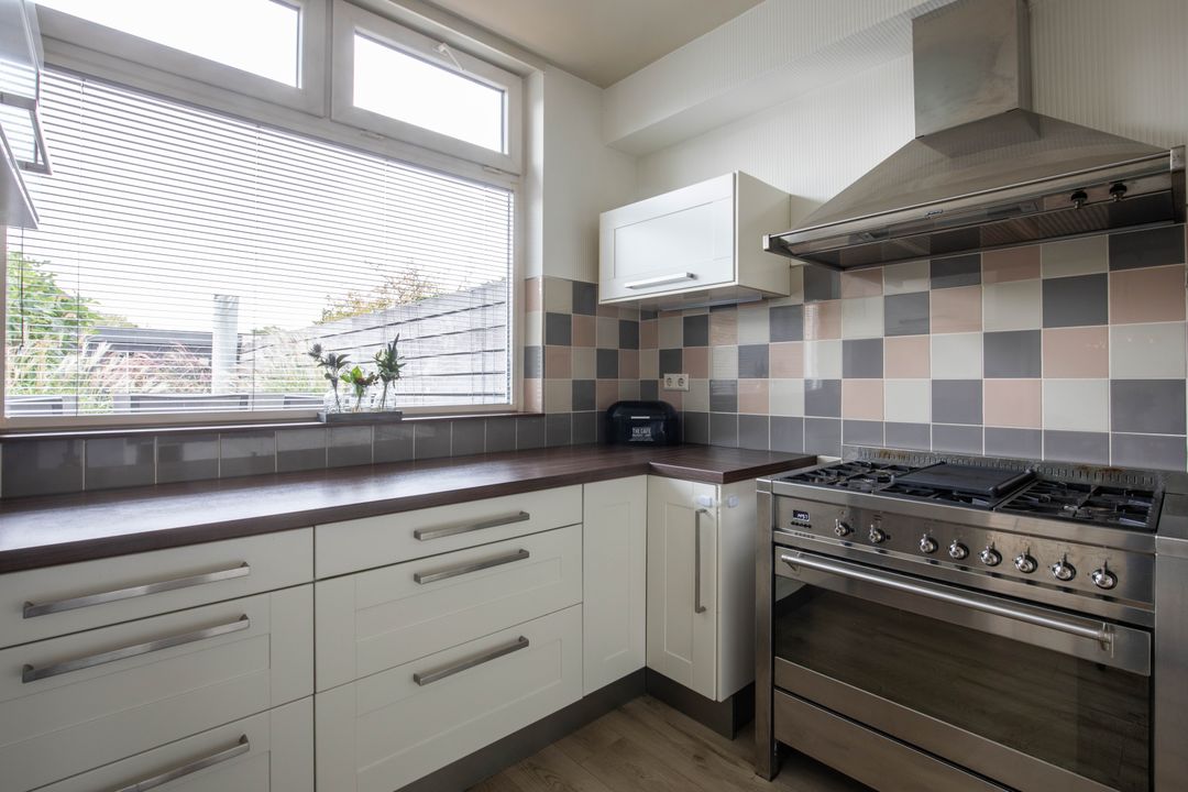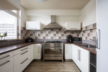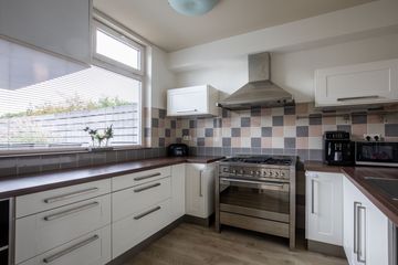 De keuken is ruim. En uitgerust met een 6-pits gasfornuis met oven en afzuigkap. De kraan is voorzien van een Quooker voor direct kokend water. Ook beschikt de keuken over een ruime koelkast en veel opbergkasten voor al uw keukengerei.