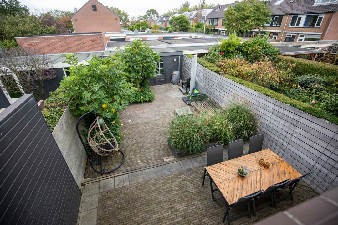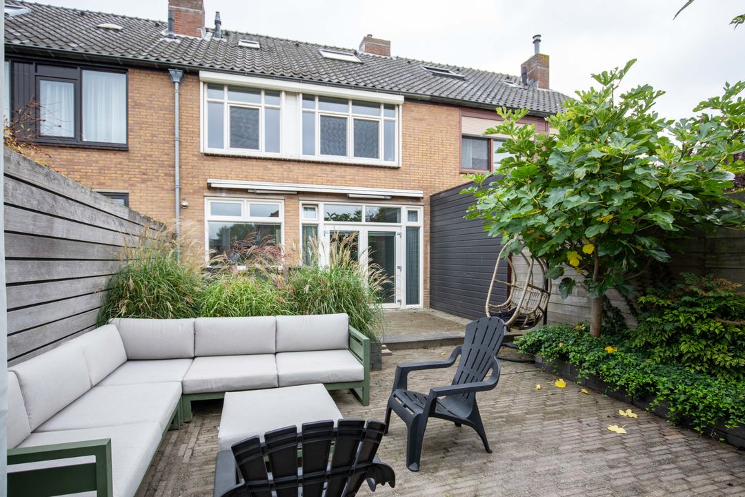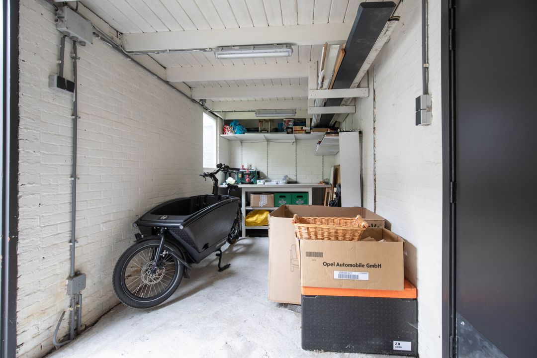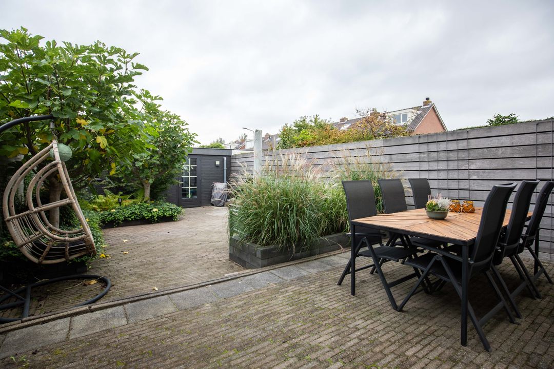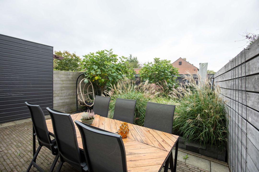 – Een diepe, zonnige achtertuin met stenen berging en achterom;