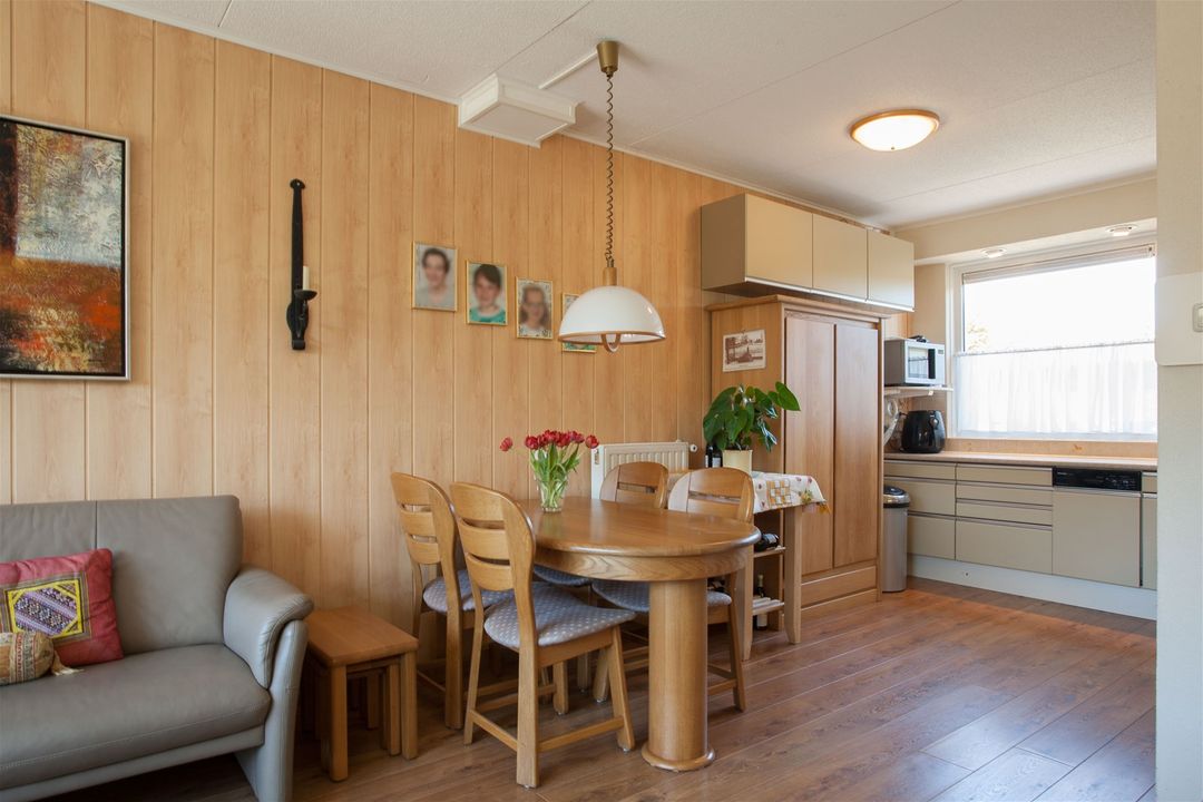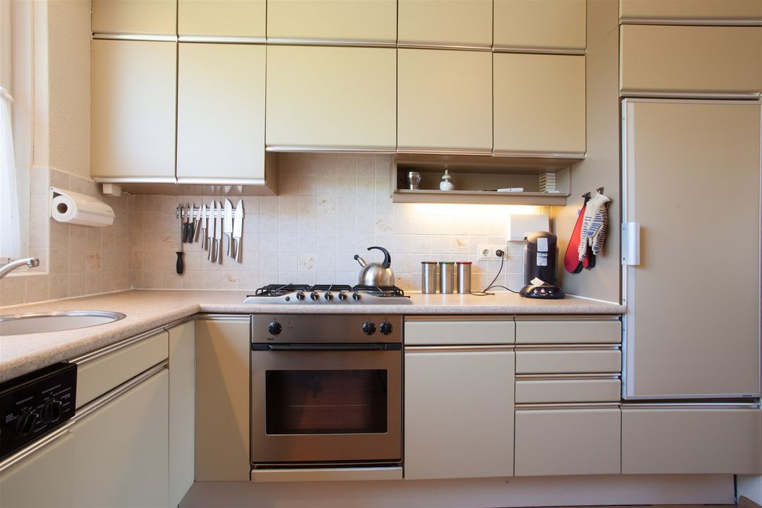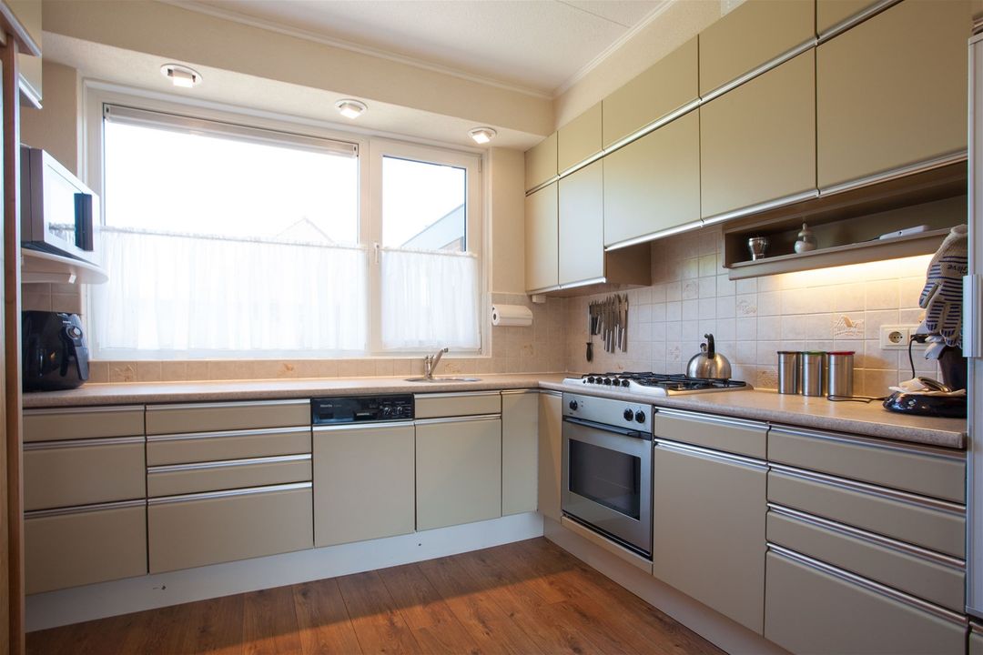 De keuken is typisch jaren ’70 maar ziet er nog netjes uit en beschikt over een oven, 5- pits gasfornuis, koelkast en een vaatwasser (Miele).
