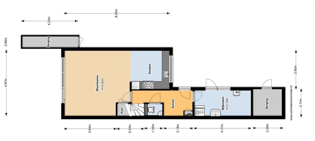Via de voortuin bereik je de entree met daarnaast een praktische berging/ bijkeuken voor fietsen en opslag. De bijkeuken is voorzien van spoelbak (warm/koud water) en elektra voor extra koel- en/of vrieskast. Ook is in deze berging de geiser(bad) en de aansluiting voor de wasmachine/ droger te vinden.