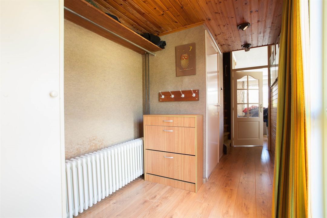 Naast de ingang van de berging is de toegangsdeur van de woning te vinden. De hal zijn de garderobe, de toilet met fonteintje en de meterkast te vinden.