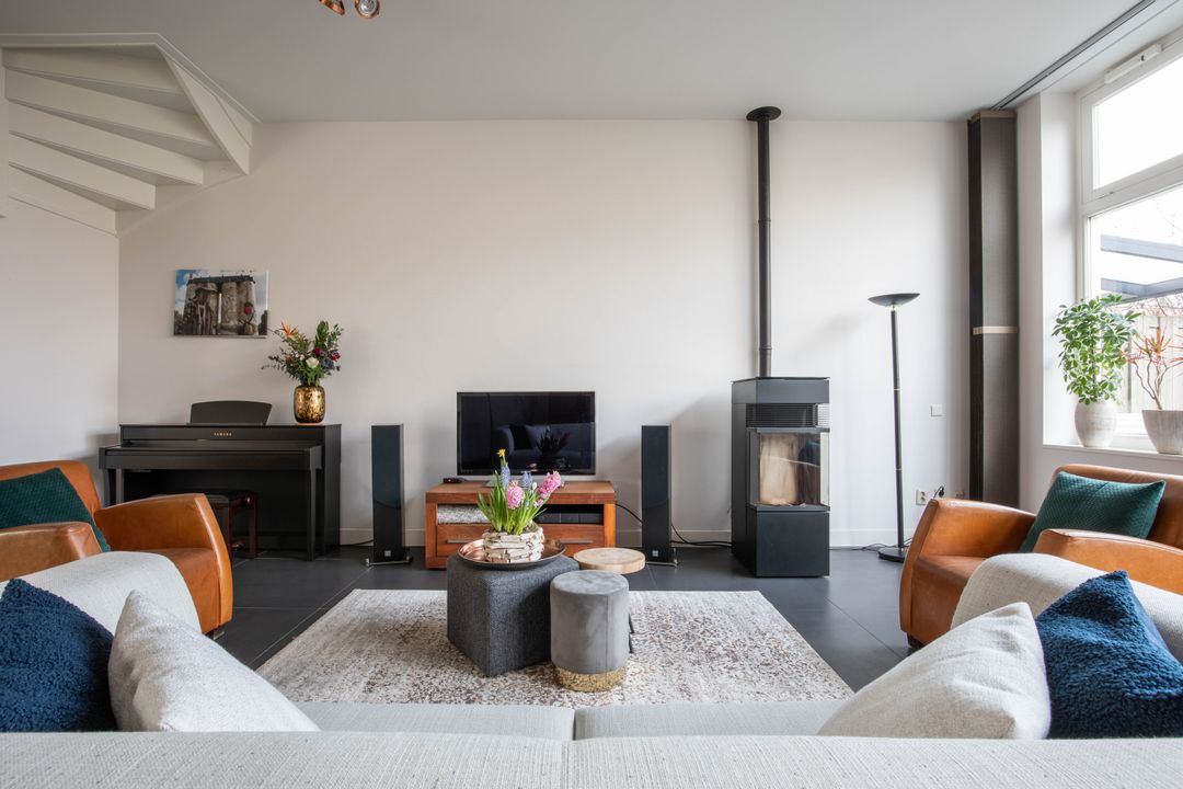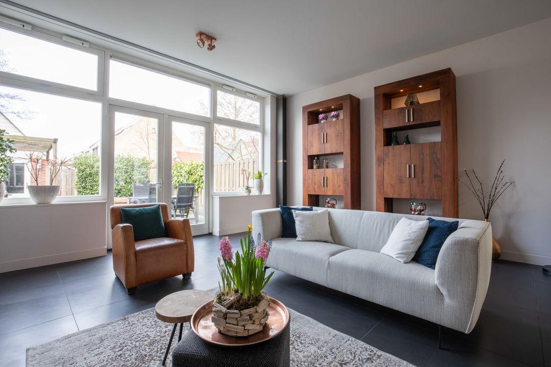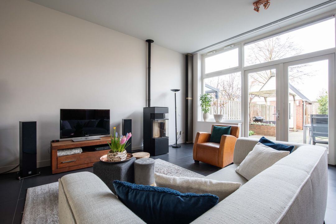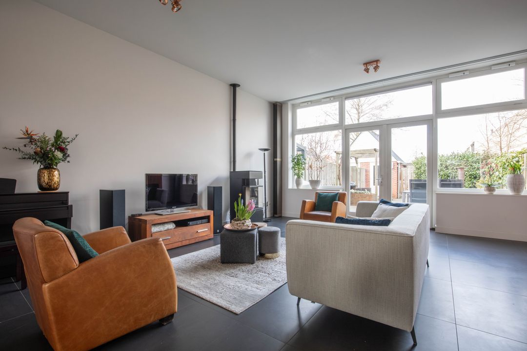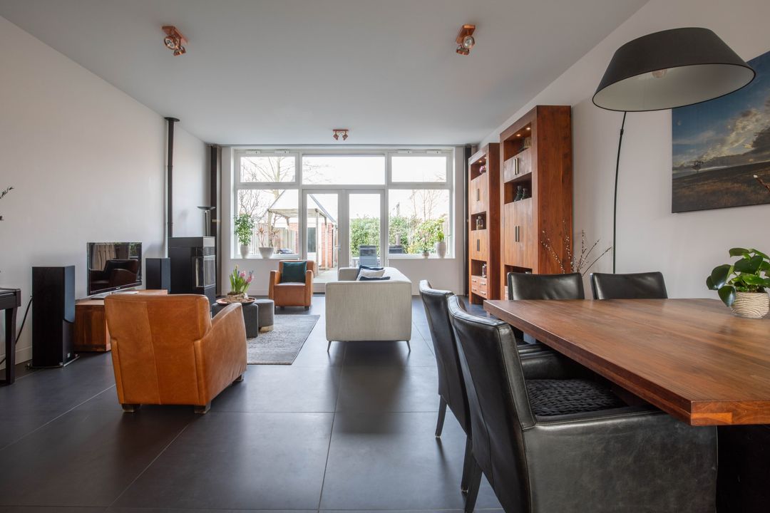 De plafonds van de woonkamer reiken maar liefst 3,20 meter hoog en laten een overvloed aan natuurlijk licht binnen via de grote raampartijen. De woonkamer is verwarmd door middel van vloerverwarming en een pellet kachel. De openslaande deuren leiden je naar de fraai aangelegde achtertuin.