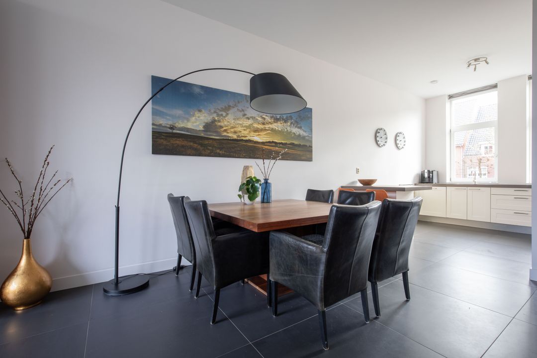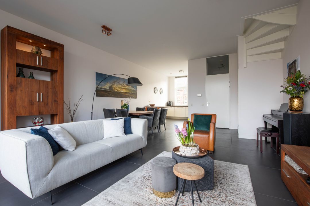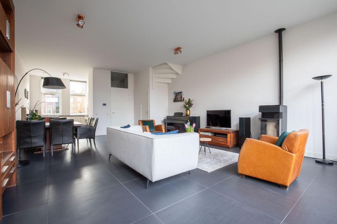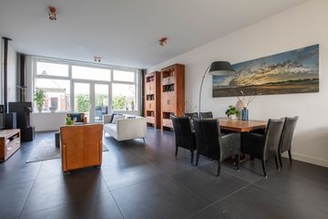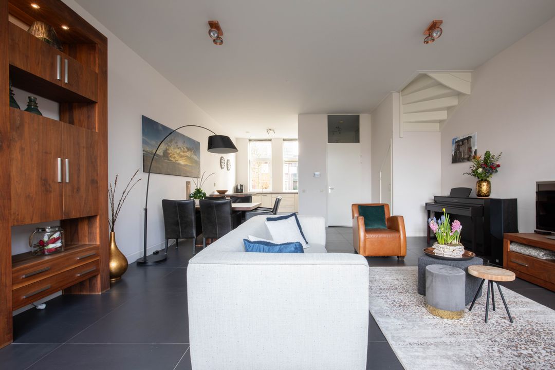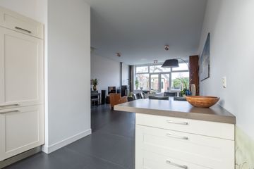 De plafonds van de woonkamer reiken maar liefst 3,20 meter hoog en laten een overvloed aan natuurlijk licht binnen via de grote raampartijen. De woonkamer is verwarmd door middel van vloerverwarming en een pellet kachel. De openslaande deuren leiden je naar de fraai aangelegde achtertuin.