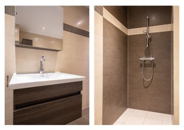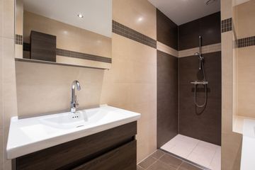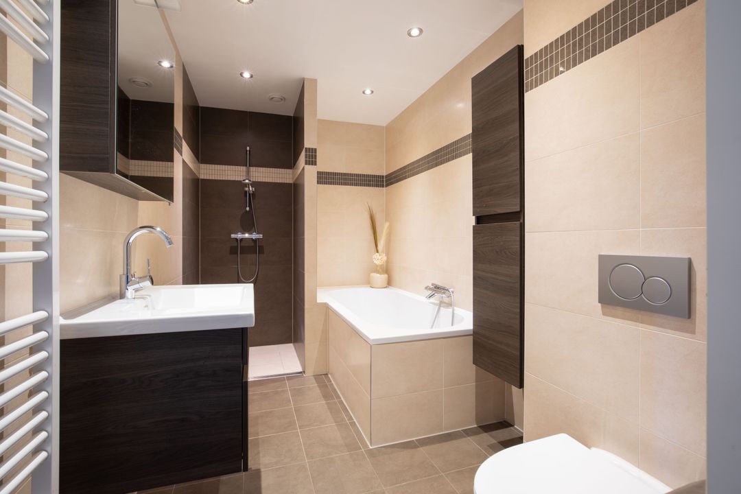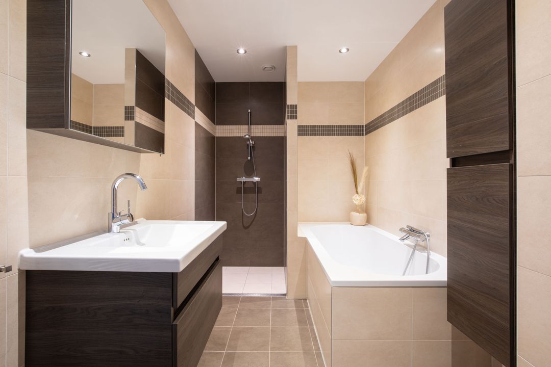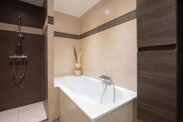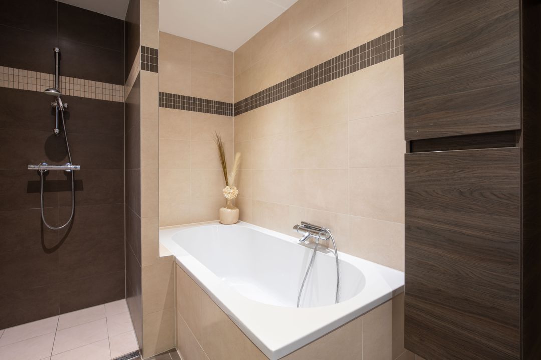 – Moderne badkamer met douche, ligbad toilet en wastafelmeubel;