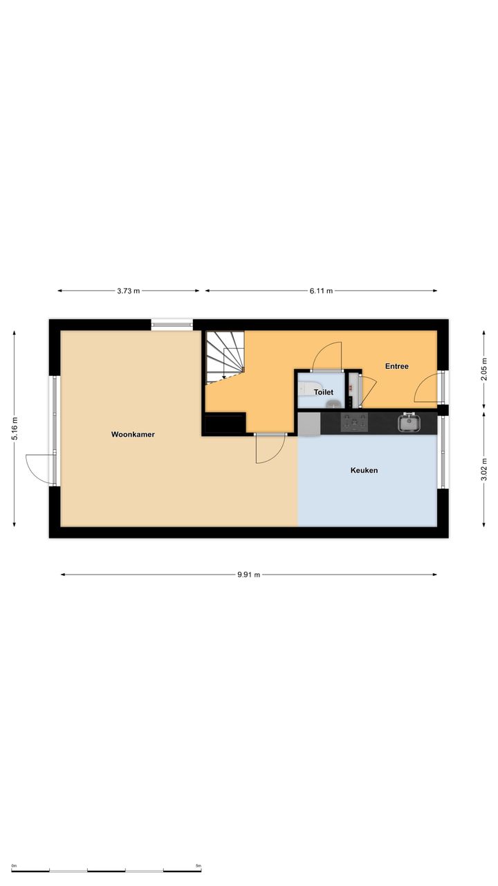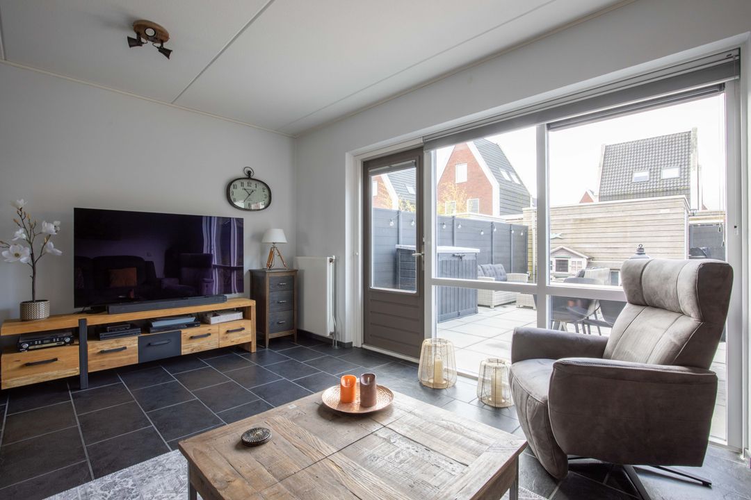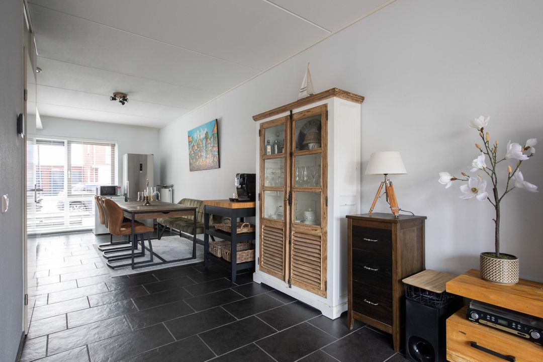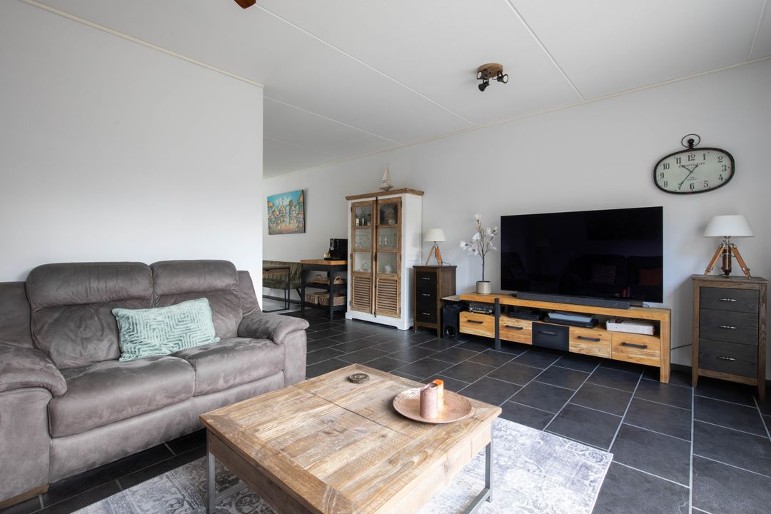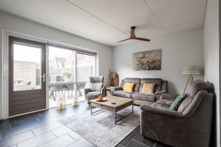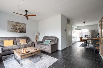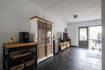 Bij binnenkomst tref je de hal met toilet met fonteintje en de meterkast. De tuingerichte woonkamer is voorzien van een grijze tegelvloer en heeft een fijne lichtinval dankzij de grote ramen. De deur leidt naar de zonnige achtertuin op het zuidwesten, waar je kunt genieten op de mooie dagen van het jaar.