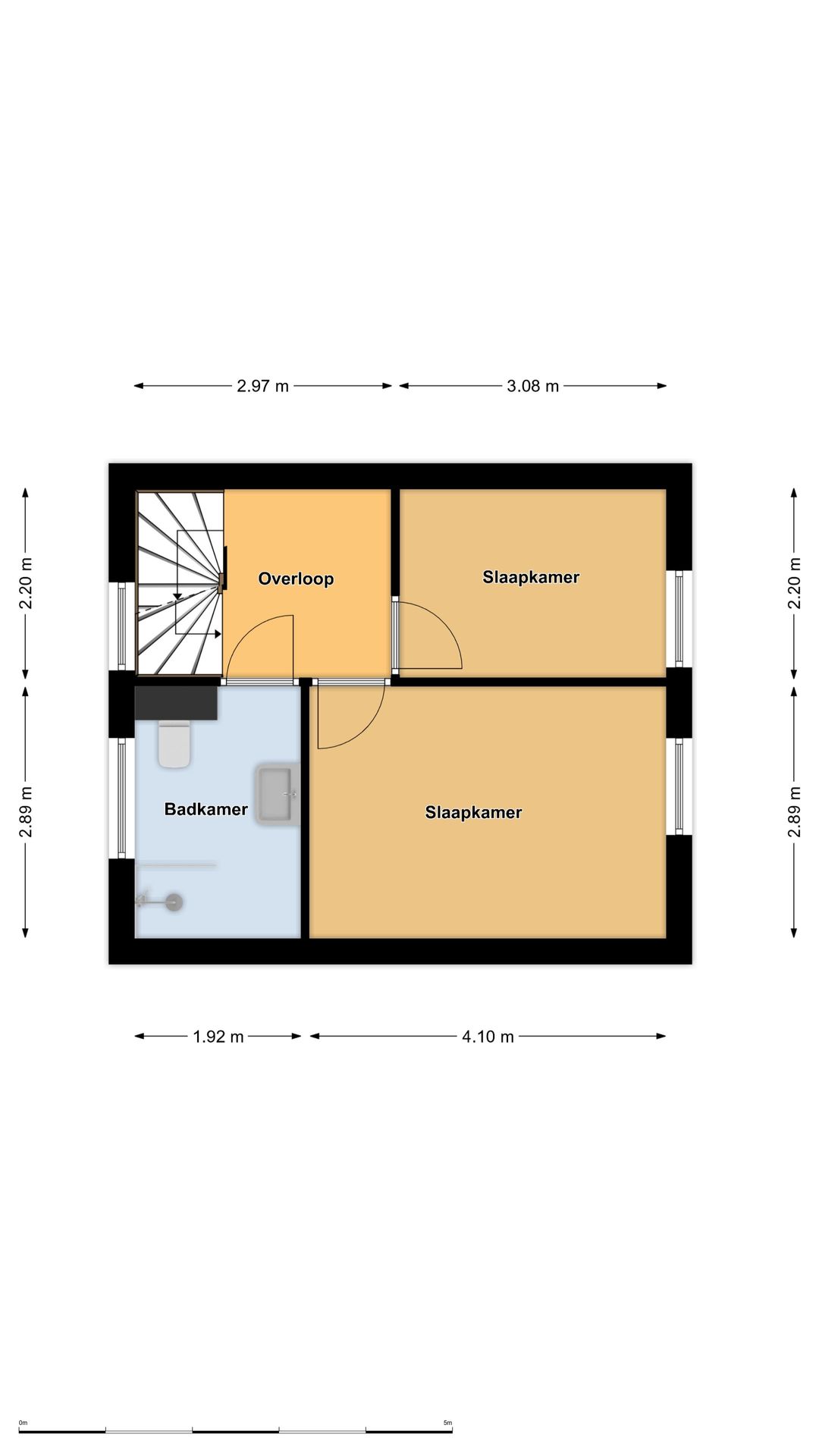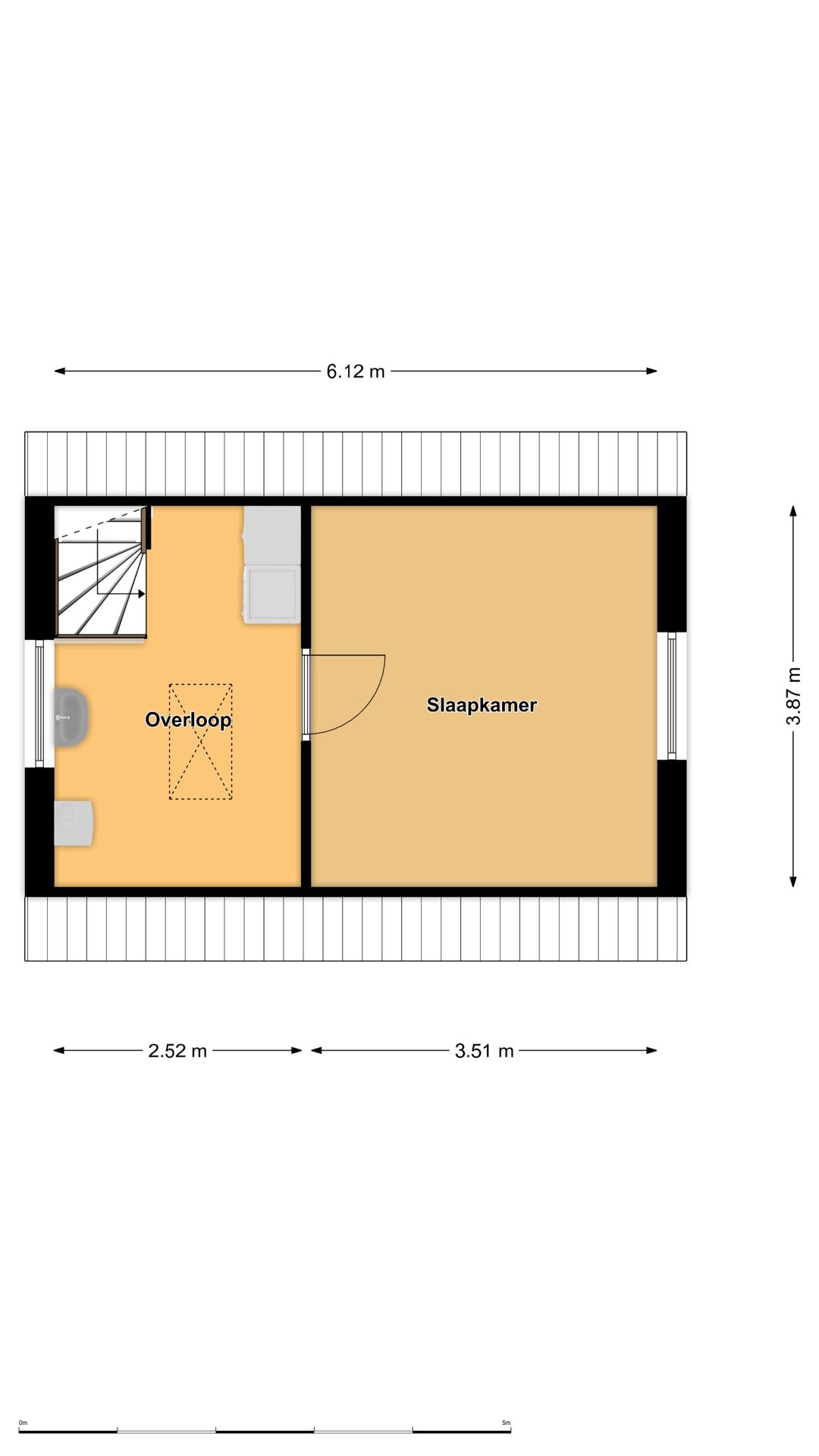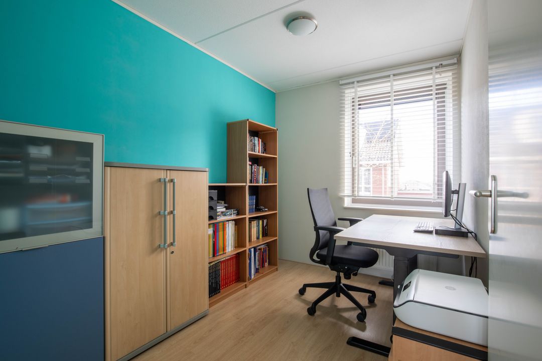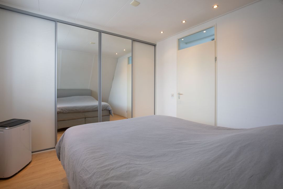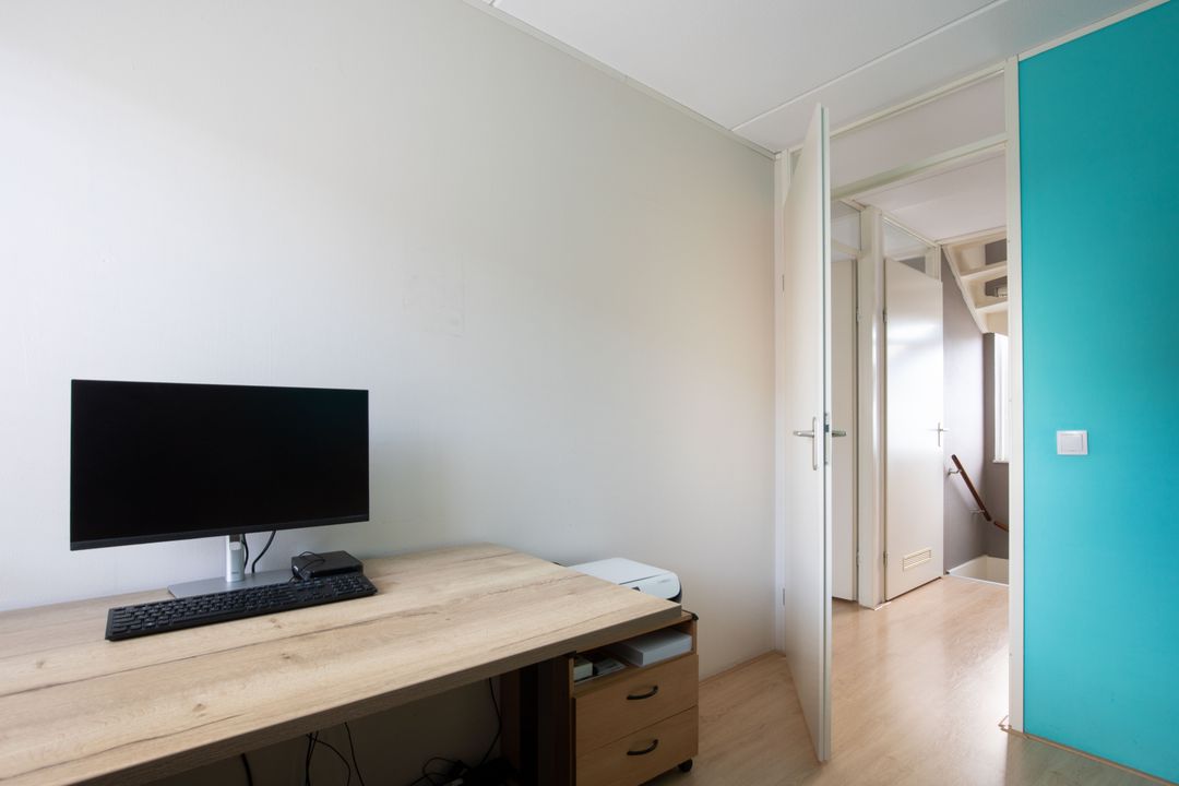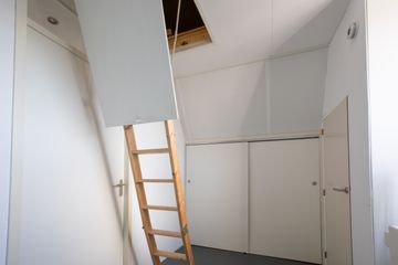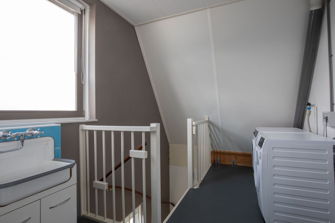 De tweede verdieping herbergt de derde slaapkamer met een vaste kastenwand met schuifdeuren. Het raam zorgt voor een fijne lichtinval. Op de overloop zijn de aansluitingen voor wasmachine en droger te vinden, naast de cv-opstelling.