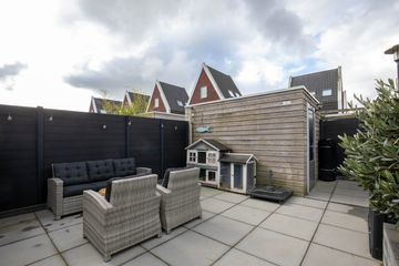 De onderhoudsvriendelijke tuin met achterom heeft een mooie border met volwassen beplanting. Het is hier heerlijk vertoeven op zomerse dagen. De vrijstaande houten berging biedt voldoende opbergruimte voor de fietsen en de tuinbenodigdheden.