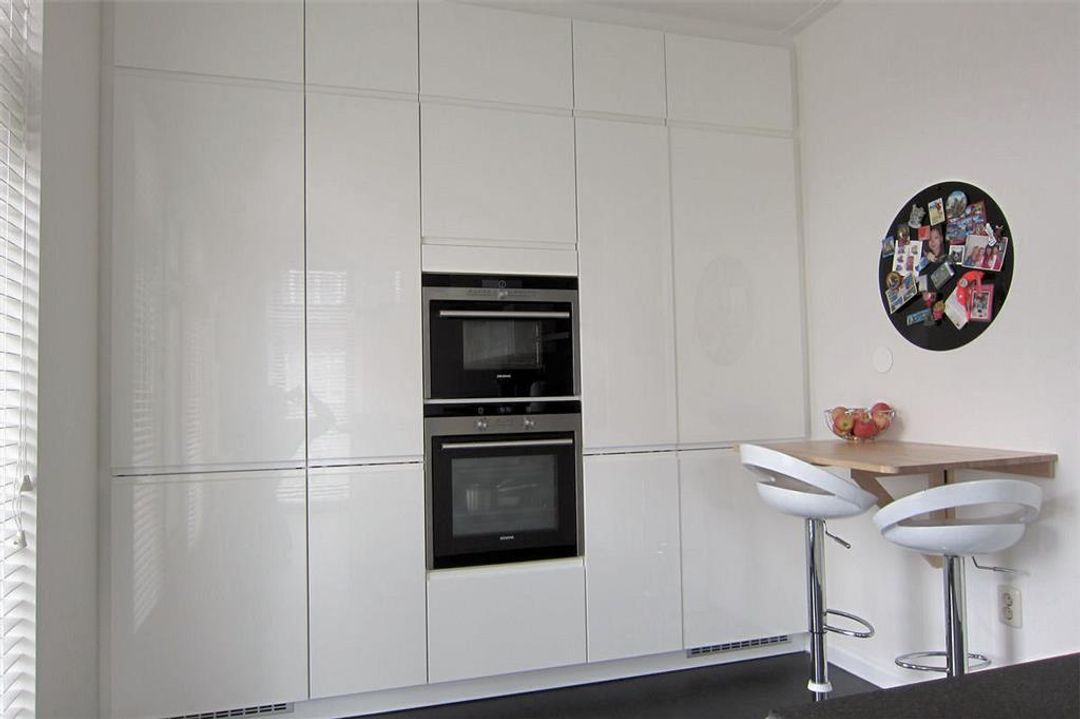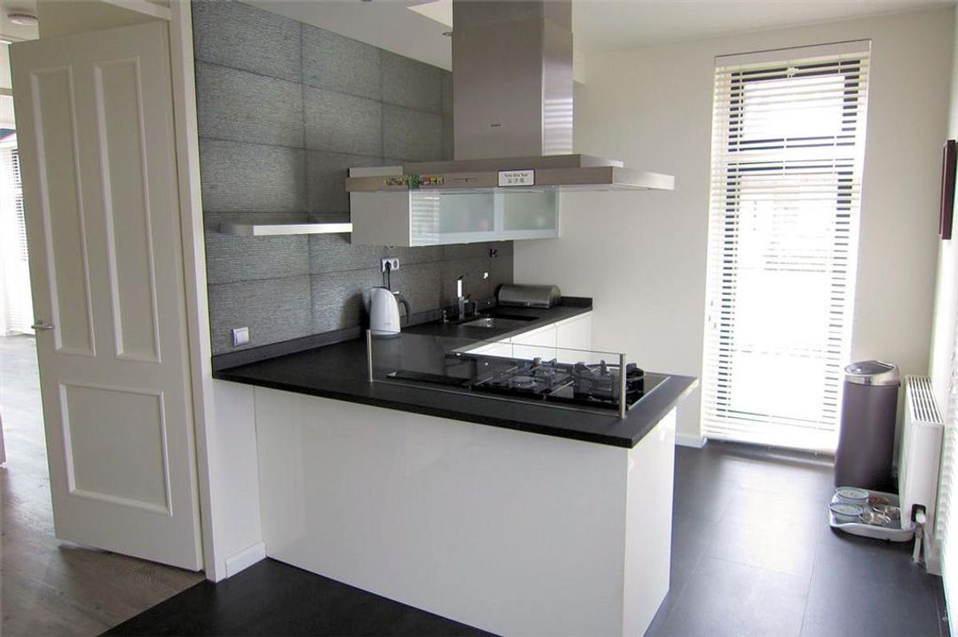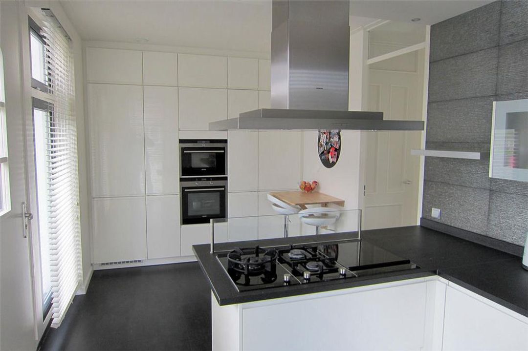 Aan de voorzijde van de woning bevindt zich de eveneens royale woonkeuken. Deze woonkeuken beschikt over een eigen buitendeur naar de voorzijde van de woning. De kwalitatief hoogwaardige (duitse) keuken is uitgevoerd in (greeploos) hoogglans wit en beschikt over een combi-stoomoven, oven, grote 7 laden vriezer, grote VitaFresh koelkast, vaatwasser, gaskookplaten, wokbrander, teppanyaki grill, rvs afzuigkap en granieten aanrechtblad.