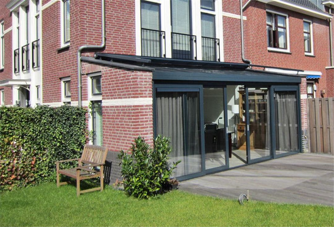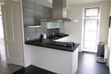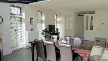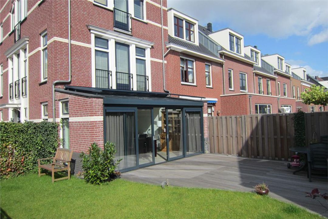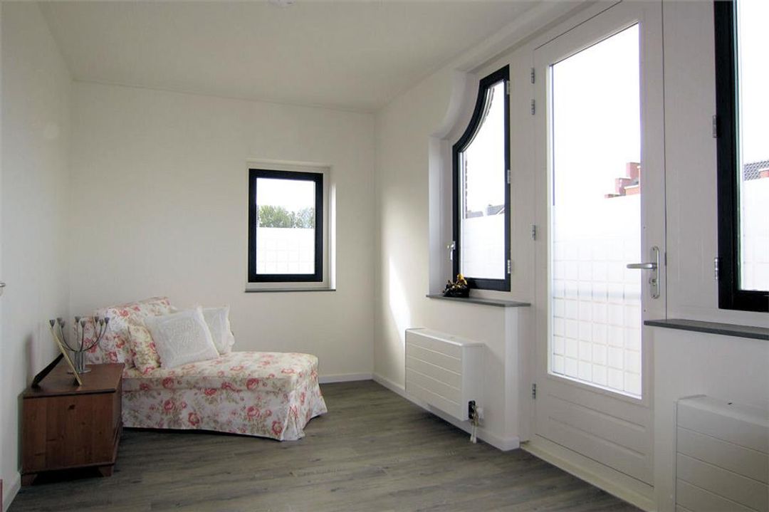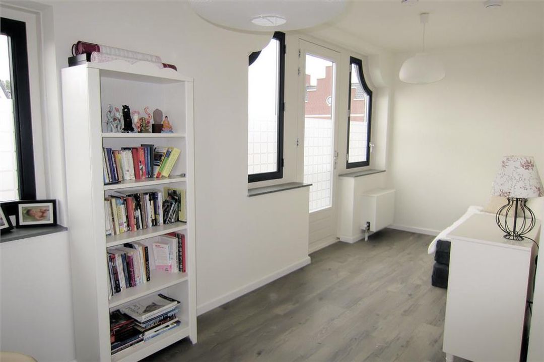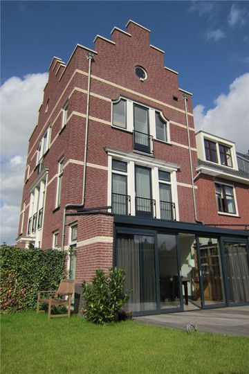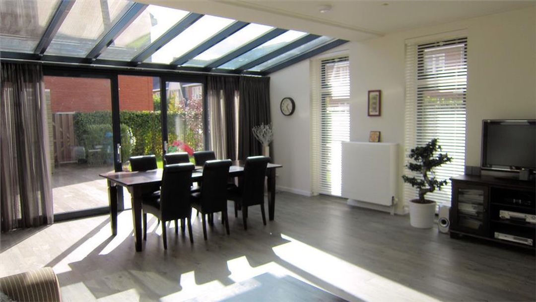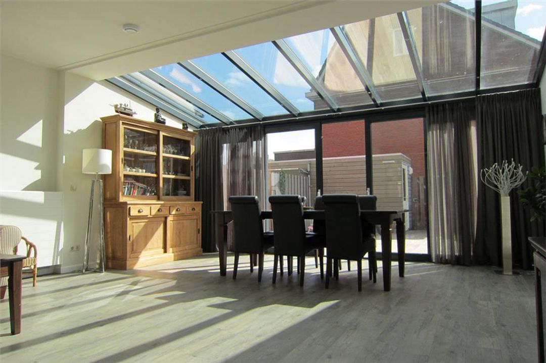 Aan de achterzijde is een 2,5 diepe serre-uitbouw gerealiseerd waardoor de woonkamer bijzonder ruim en heerlijk licht is.