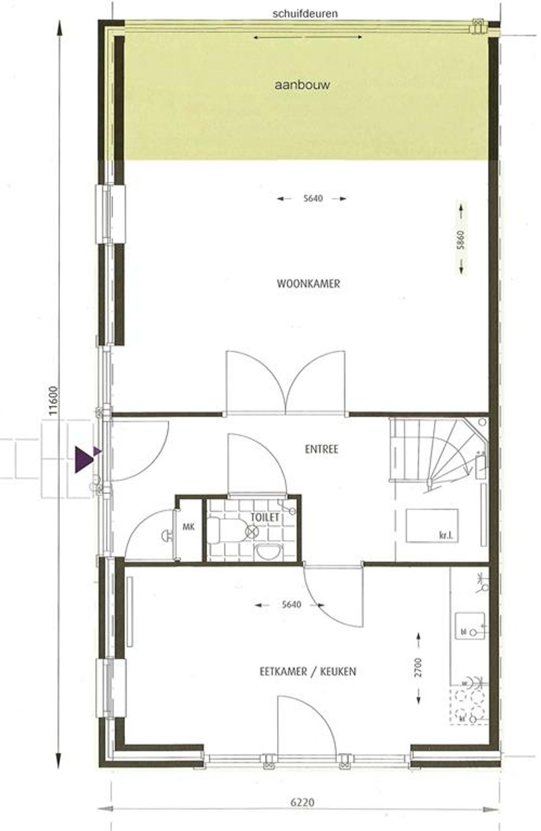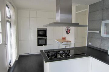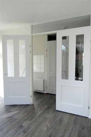 Middels twee hoge openslaande deuren komt u in de ruime woonkamer die aan de achterzijde middels een serre-uitbouw 2,50m is vergroot. Deze aanbouw beschikt over een elektrische zonwering, inbouw-spotjes en grote schuifdeuren.