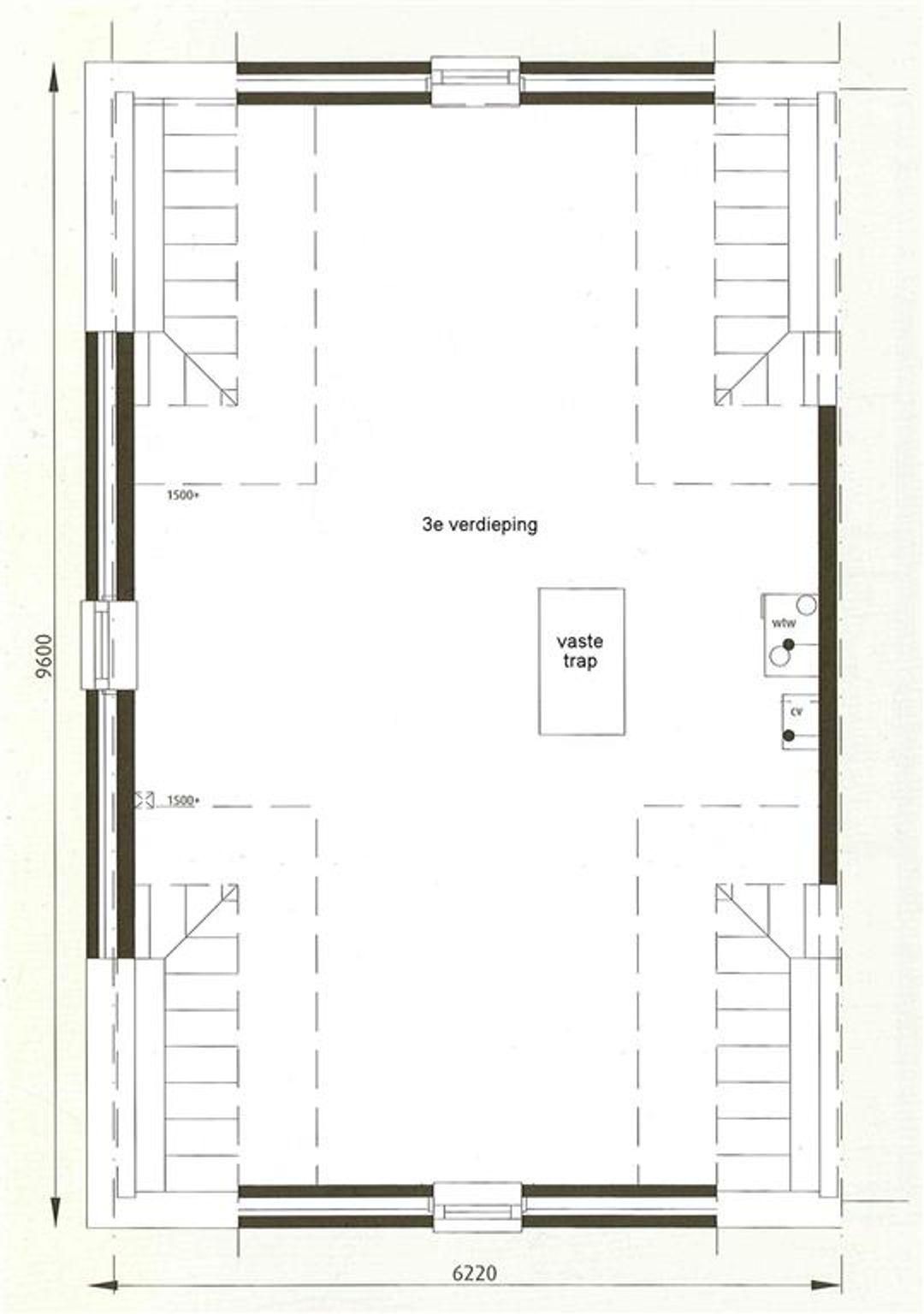 De woning was standaard uitgevoerd met een vlizotrap naar de derde etage. De huidige bewoners hebben een vaste trap laten maken zodat deze etage functioneel gebruikt kan worden als kantoor/werk/logeerkamer. Tevens bevindt zich hier de HR Intergas Prestige HR 107 ketel met extra warmwatercapaciteit en de aansluitingen van de was- en droogapparatuur.